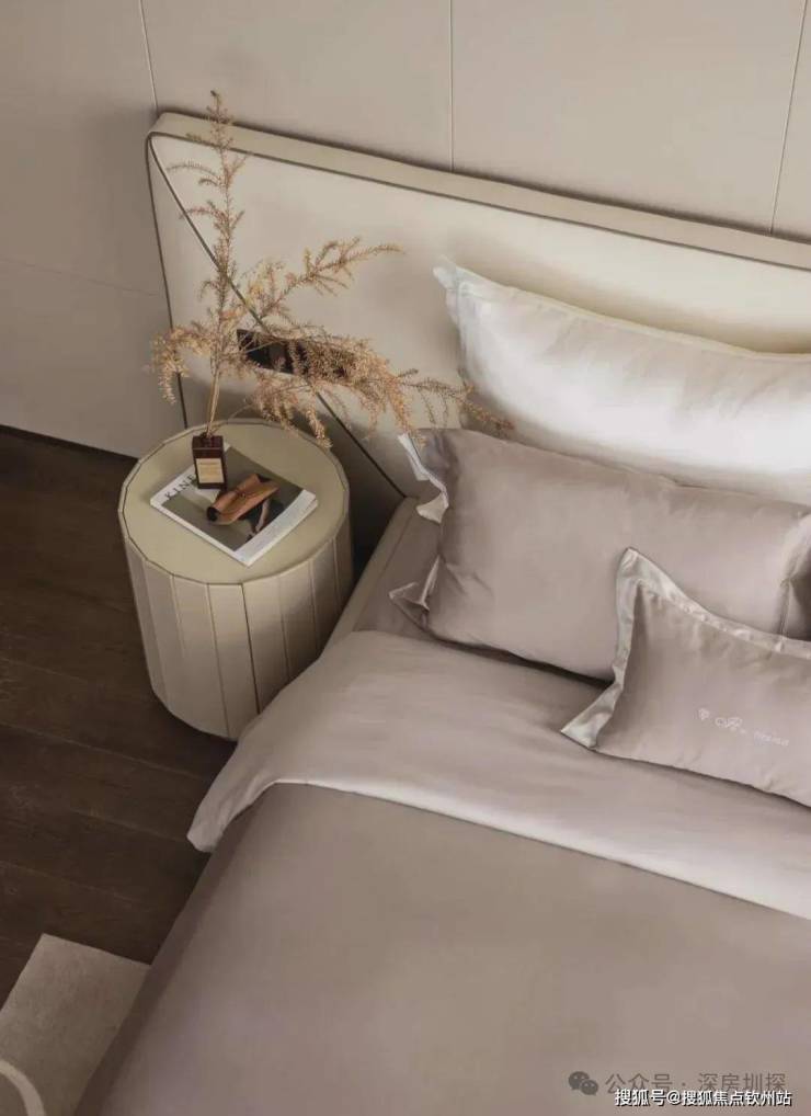 卧室以木棕与静白拼接,营造安谧、舒适又温柔的艺术氛围。自然质朴的原木色与灰白色调相融,尽显轻盈温馨,带来自然愉悦之感。圆润造型柔化室内氛围,弱化空间秩序与理性,平衡体验,释放温馨暖人的视觉效果。