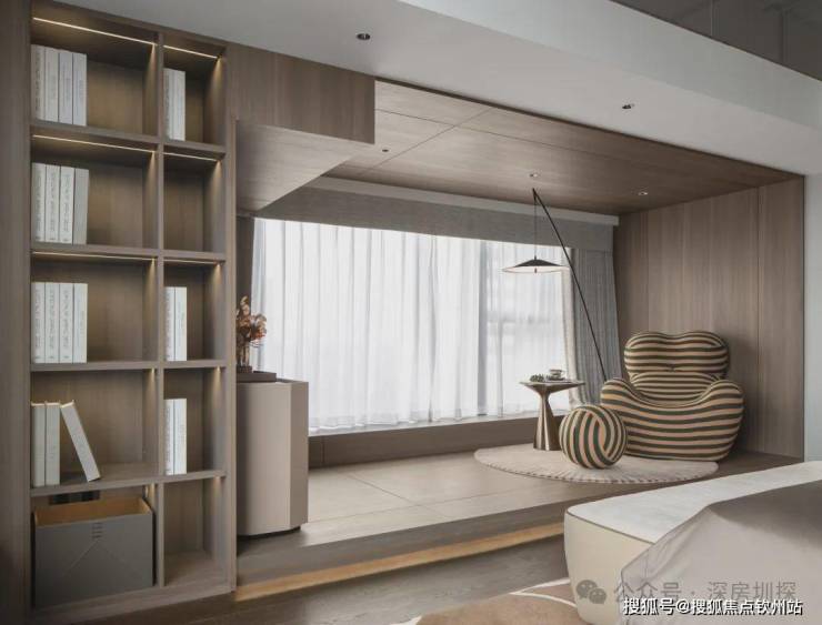借卧室特殊空间,向外拓展出休闲区。巨幅落地窗,最大程度引入自然光,拓宽视野。白天,此处是观景佳处,深圳湾壮阔海景尽收眼底,看海鸟戏浪,内心顿感安宁。夜晚,华灯初放,这儿成了独酌静思的精神圣地。一杯美酒,在暖光下,酒杯与无尽夜色共舞,一天疲惫随之消散。