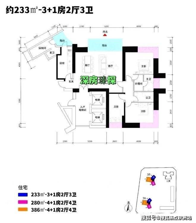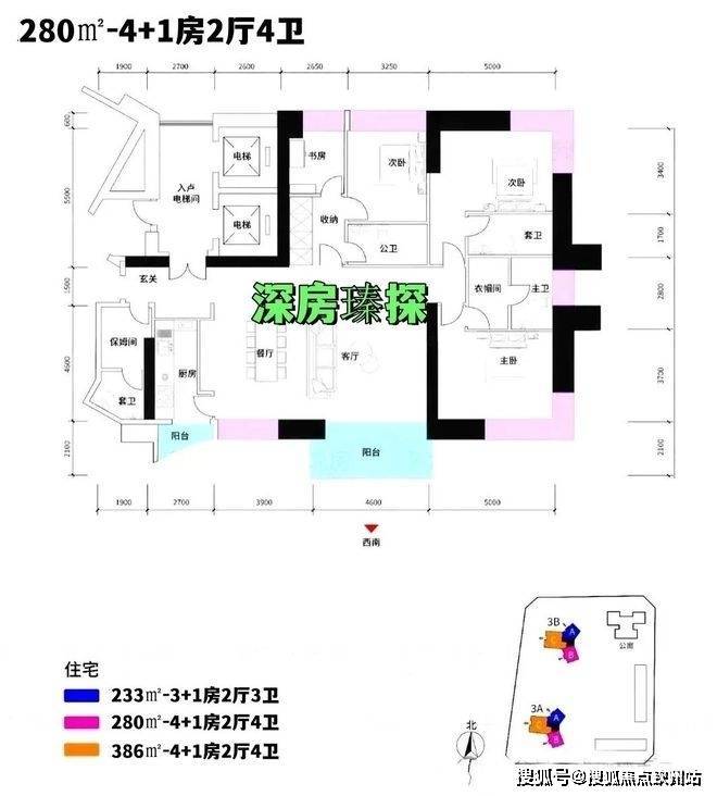 280㎡的4房2厅3卫+家政套间,仅3栋A/B座B户型,双梯入户,设计的是横厅格局,客餐厅8.5米开间,主卧大套间约25㎡,大次卧套间约19㎡(不含卫生间),小次卧约11㎡/8.7㎡,另外还有保姆套房,L型厨房,得房率约78-82%(包含赠送),约9.66㎡观景大阳台,西南朝向,看高尔夫景观。