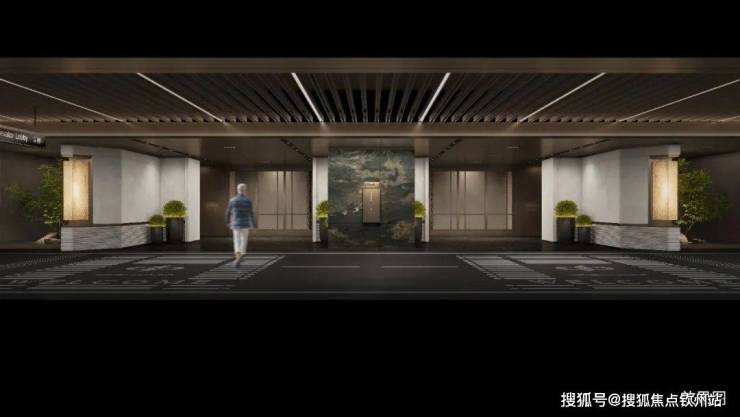 车库双大堂设计,大面积采用天然浅色石材,并于天然奢石加以点缀,光厅顶面采用金属构件,结合灯带,增加层次感,彰显项目高定品质。