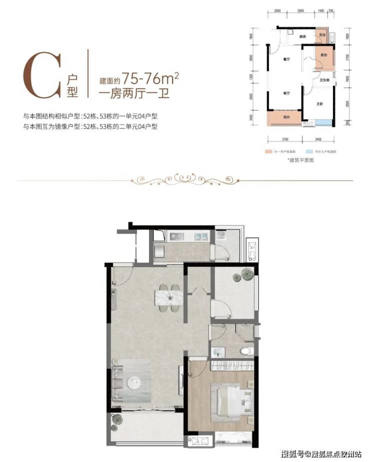 约75-76㎡ 1房2厅1卫 |纯南向全明户型,小户型大空间,约3.7m观景阳台,一揽风情园林,客餐厅一体布局,延展生活尺度,南向大尺度主卧,阳光美景相伴