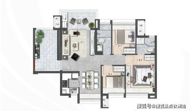 这个户型是上乘蓝岸的皇牌户型,88㎡就能做到4房,得房率110%