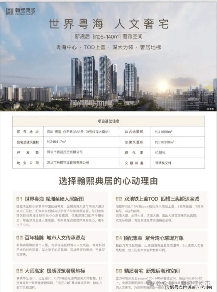 深湾CBD丨时代粤海的蝶变新章深湾CBD立足南山区“双核”战略核心,串联科技园、后海、深超总、深圳中央公园,聚合金融、科技、人文生态超级闭环,以多维战略产业叠加,重塑粤海价值天际线。翰熙典居,是继华润城之后深湾CBD又一人居地标之作,以时代中心之上的奢居基因,铸就跨越周期的矜贵人居恒产。