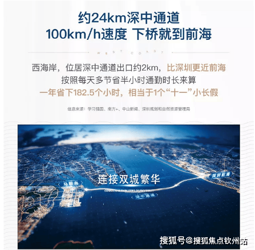 项目距深中通道中山匝道口约2km(建设中,预计2024年通车) 距轨道2号线马鞍村站和科技金融城站约2km(规划中) 距现中山港客运口岸约14km,距新中山新港客户码头约3km(建设中)距中山站约16km,距中山北站约22km 深圳33号地铁线(规划中)规划时速160km/h,接驳深圳南山 广州地铁18号线(规划中):预留马鞍岛站点,半小时至珠江新城 中山轨道2、4号线(规划中):接驳深中通道,连通中山市区 市内快速路:翠亨快线(已通车),中山世纪大道(建设中)联通全市"深中通道约24KM,100KM/h速度,下桥就到前海。