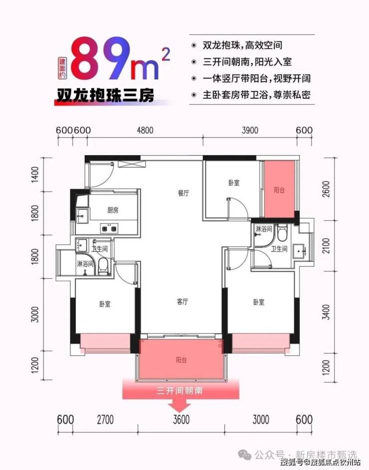 建筑面积约89㎡三房两厅两卫,东南朝向,双阳台,主卧套房设计