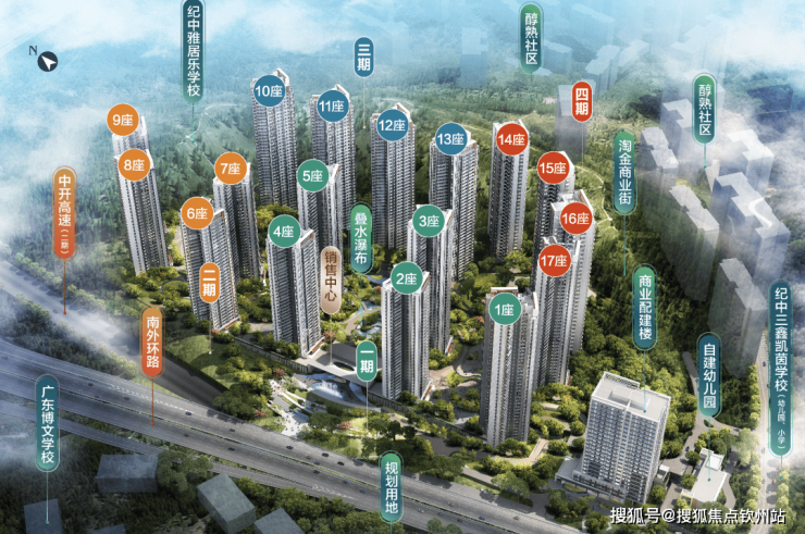 该组团占地17万㎡(折合约255亩),共有17栋高层住宅,层高33-39,容积率2.0,绿化率≥36%。
