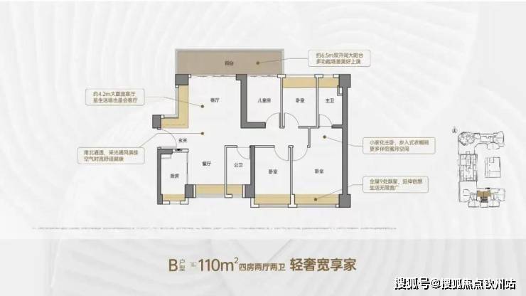 110㎡4房2卫,竖厅南北通透格局,客厅开间4.2米,阳台主朝北向。