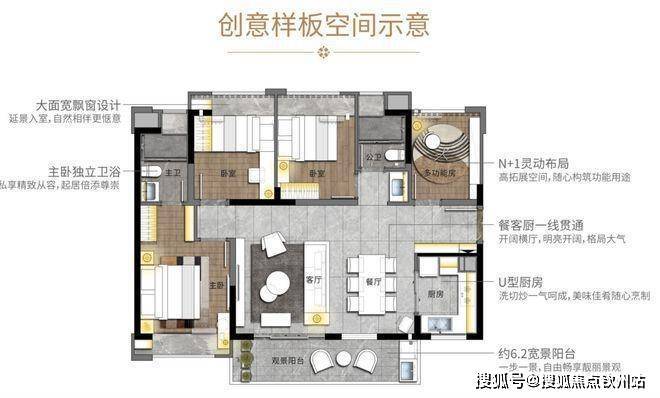 这个户型以实用为主,2+1个房间的空间均很阔绰,可以当卧室使用,实实在在满足置业者的居住需求。同时,户型还带约6米宽的景观阳台,采光、视野佳,这一般都只有改善户型才能做到,的确让人惊喜。