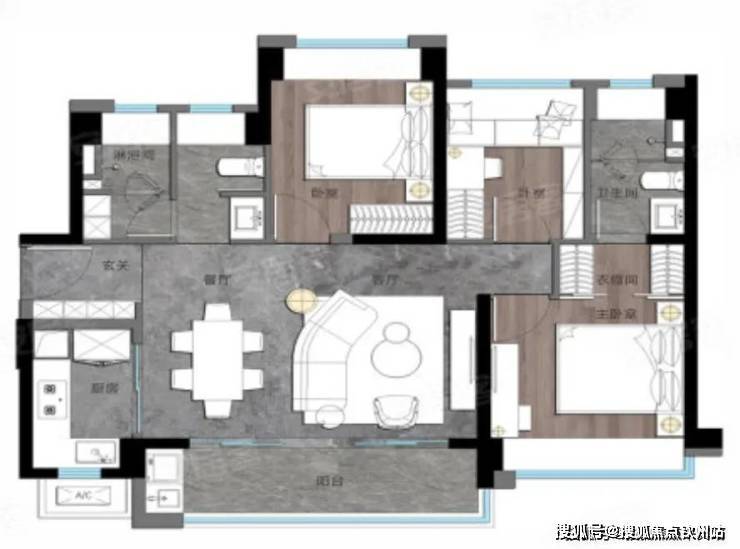 100㎡户型(竖厅), 3室2厅2卫1厨