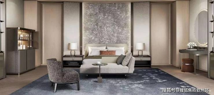 这样的空间尺度,放眼全东莞的豪宅大平层,都是非常少见的。主卧全景南向落地玻璃,躺在床上就能欣赏中心公园和高楼城市景观,世界就在脚下。