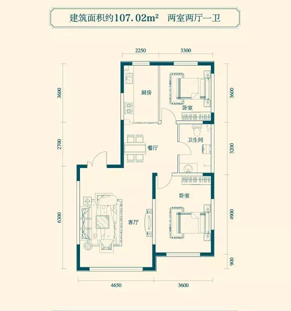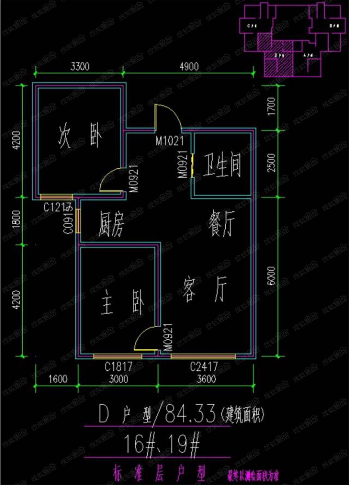 2室1厅1卫-16#、19#楼 D户型 建筑面积 84.33㎡