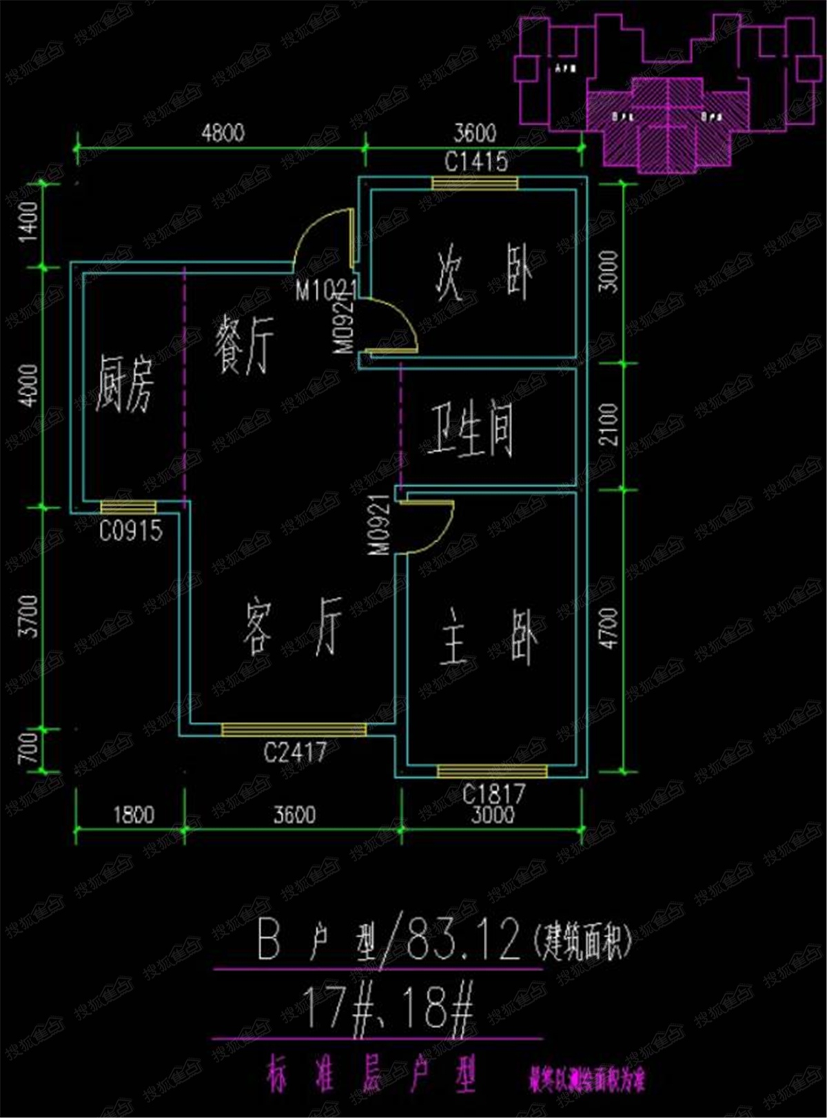 2室1厅1卫-17#、18#楼 B 户型 建筑面积 83.12㎡