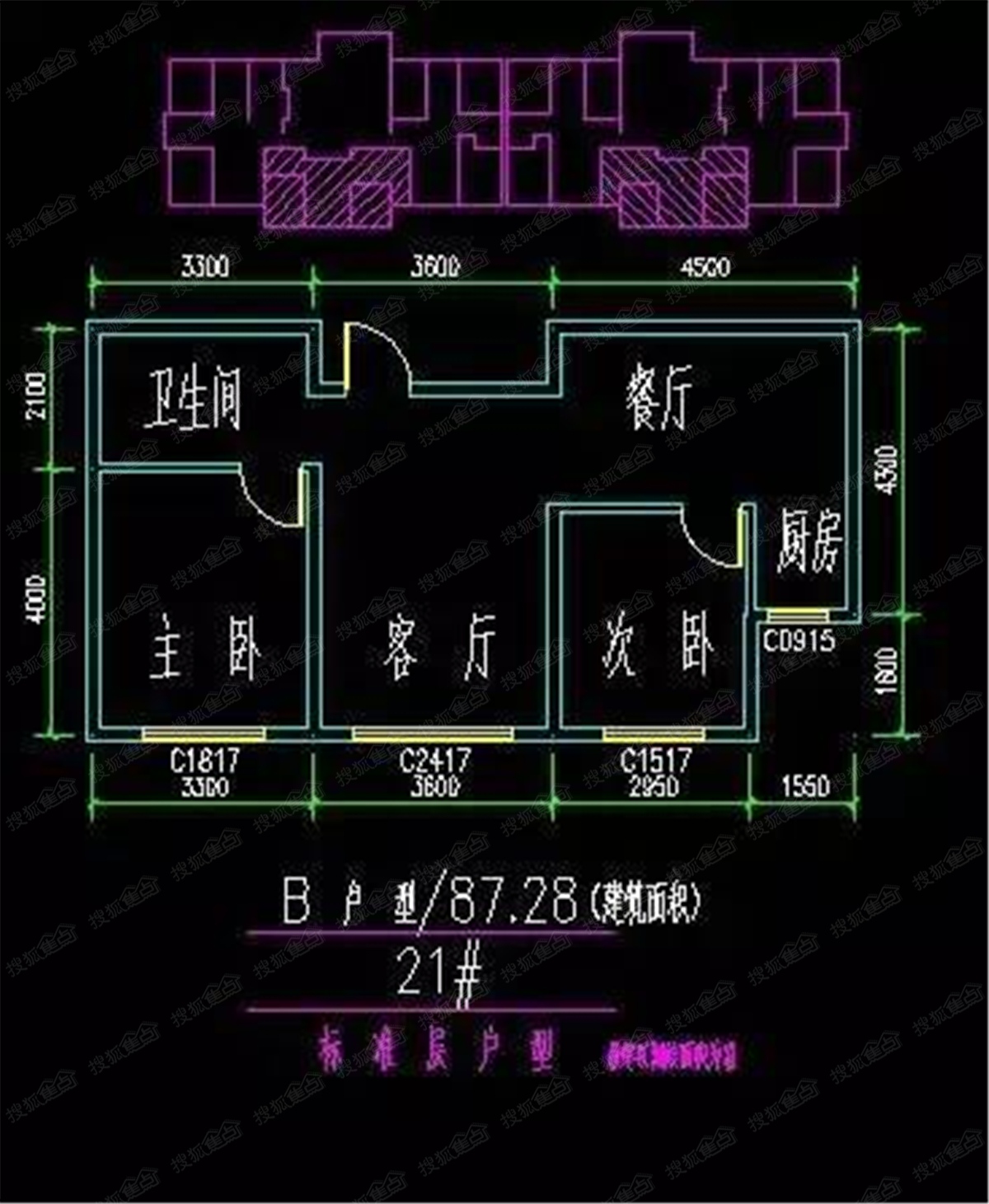 2室1厅1卫-21#楼 B 户型 建筑面积 87.28㎡