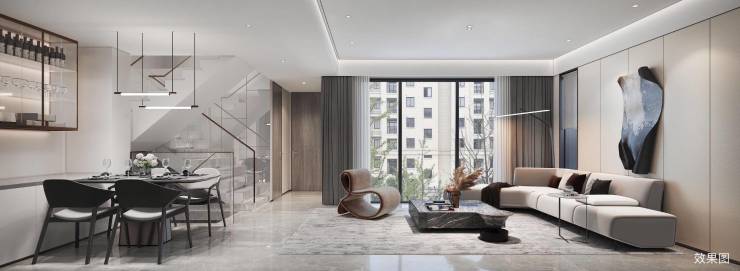 建筑风格:米白色外立面和灰色金属漆的应用,让极富现代感的高层建筑倍增科技感和优雅气质,符合现代精英的审美选择;而真石漆的质朴正与建筑融于自然的气质相契,营造质朴沉稳的新中式居境。