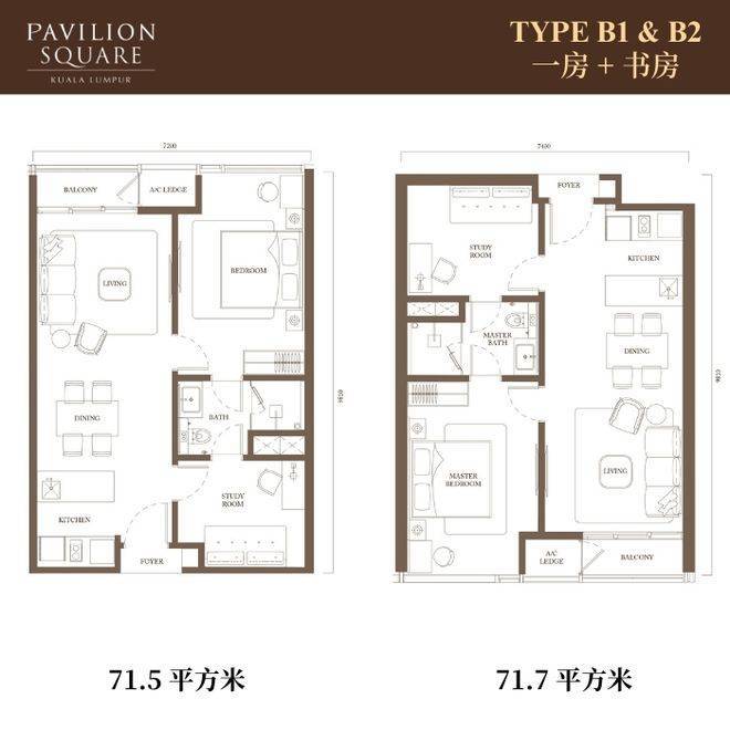 一房+书房:1,864,000马币起(71.5-71.7平方米)