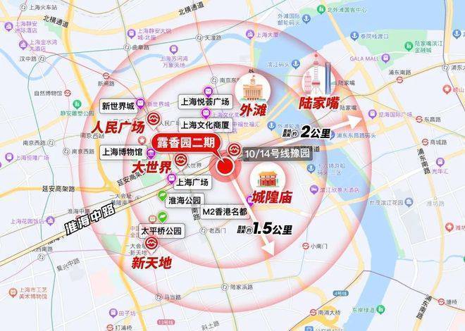 1.5公里内涵盖人民广场、外滩、新天地、淮海路、陆家嘴等上海地标级商圈,一城繁华尽收囊中;和平饭店、浦东香格里拉酒店金茂君悦、雅居乐万豪、马勒别墅饭店等高端酒店环伺;黄浦区政府、豫园、城隍庙等政务、娱乐配套皆具。