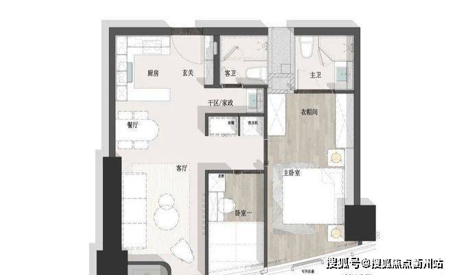 主卧东面采光,宽奢套房设计,独立卫生间双面盆设计,超大衣帽间配置;