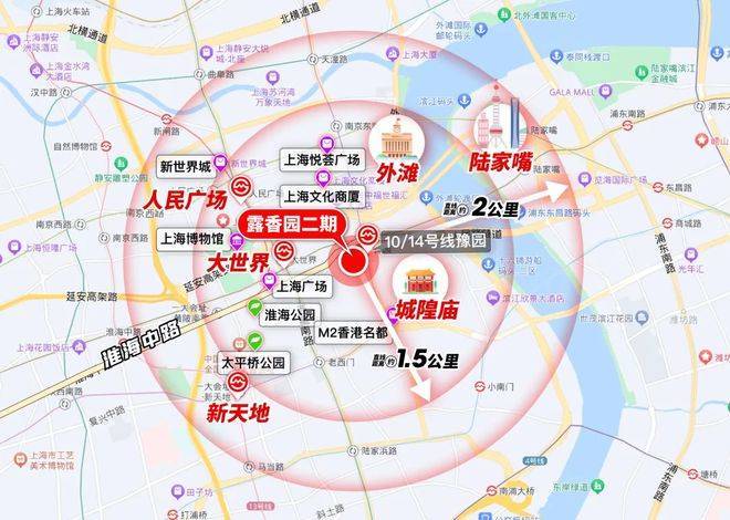 1.5公里内涵盖人民广场、外滩、新天地、淮海路、陆家嘴等上海地标级商圈,一城繁华尽收囊中;和平饭店、浦东香格里拉酒店金茂君悦、雅居乐万豪、马勒别墅饭店等高端酒店环伺;黄浦区政府、豫园、城隍庙等政务、娱乐配套皆具。