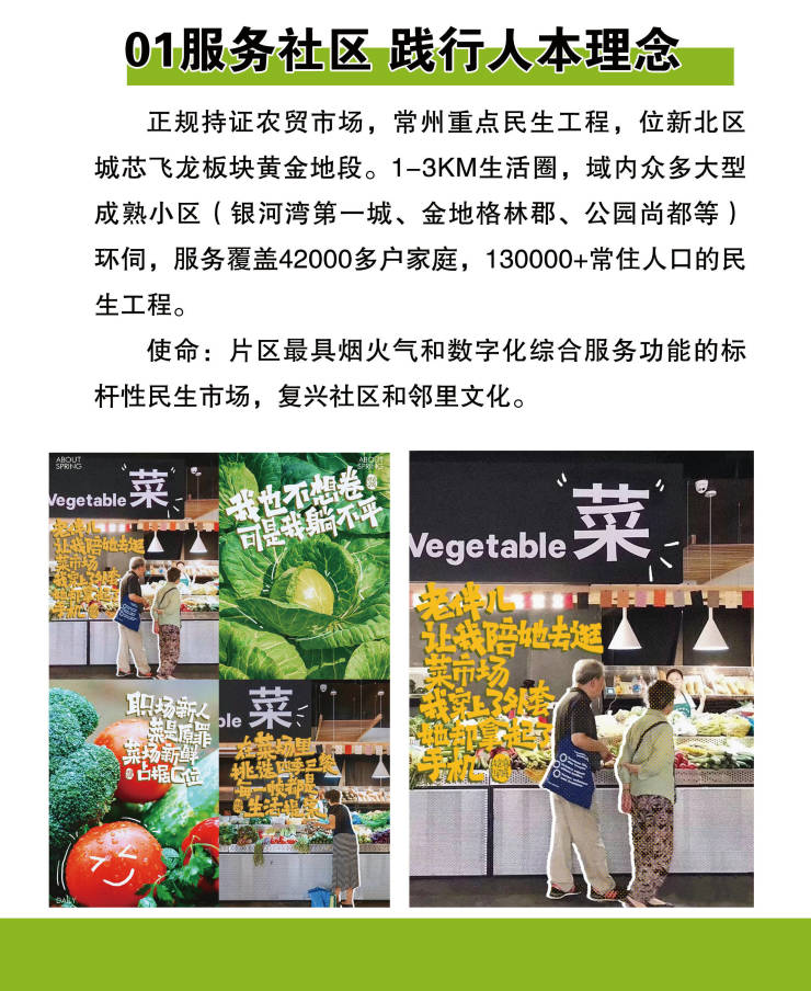 产品特色介绍:市场上在售持证正规农贸市场,飞龙烟火邻里总建筑面积约3300多平方,由20个环岛铺和周边30余个边铺组成,业态丰富且分布合理,其中不仅包含蔬菜、水果、豆制品、肉类、禽蛋、水产海鲜、熟食、凉拌菜、酱菜、干货等,还有健身房、儿童乐园、社区医院、餐饮加工等业态。