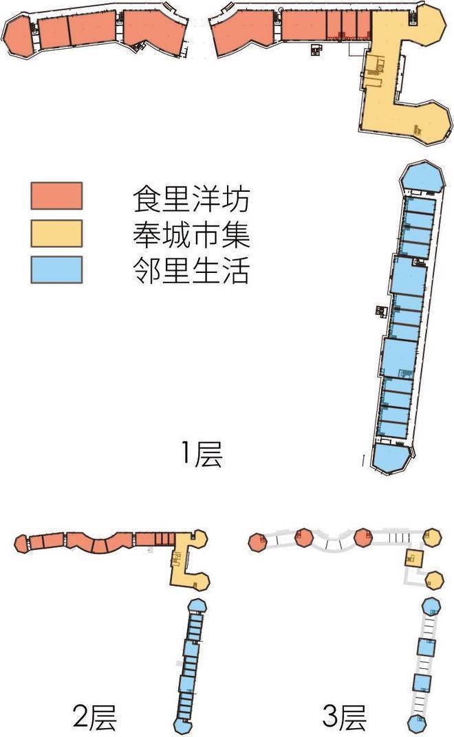 整个兰博广场由食里洋坊(兰博路侧)、邻里生活(邮电路侧)、奉城市集(兰博路邮电路交汇处)三个组团组成,总建筑面积17216.74㎡,其中地上三层建筑面积10963.25㎡,地下一层停车库建筑面积6253.49㎡。