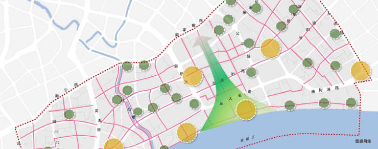 项目南向约 6 公顷的规划绿地,与城市连廊体系呼应,融入国际滨水垂江视廊,与黄浦江滨江绿地衔接,与城市生息共融,形成“社区-绿地-滨江” 的 T 字型生态脉络。