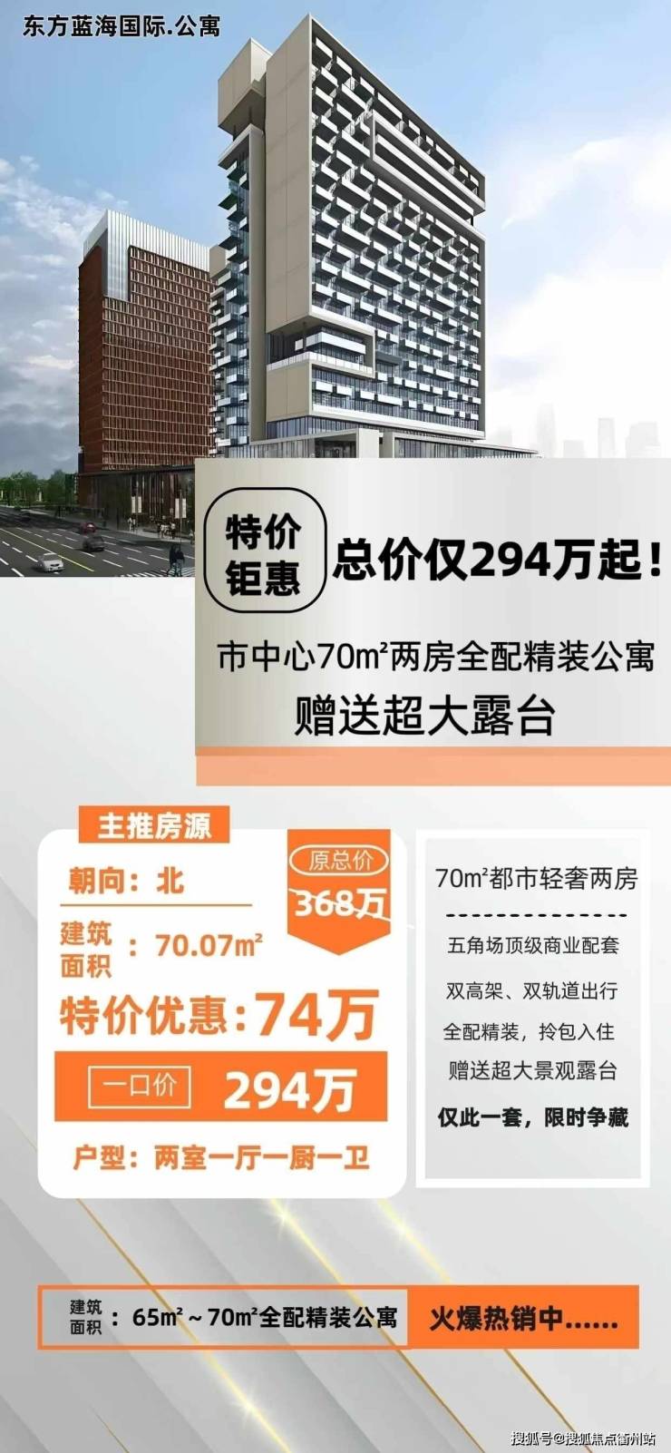 东方蓝海国际公寓】不限购!推出面积68-71㎡,精装现房交付,送软装,拎包入住!