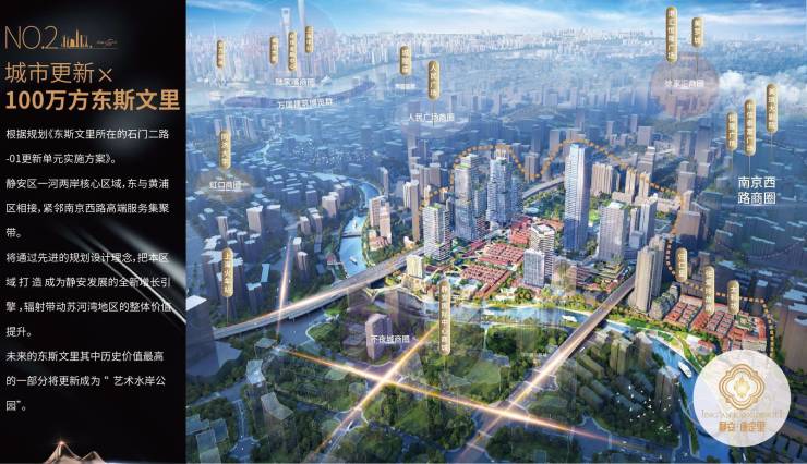以“人文百年斯文里,静安苏河金融湾”为愿景,打造苏州河沿岸的 高端金融枢纽地、艺术文创集聚区、中部为金融商务区,两侧为品质生活区,北侧为公共活动区,南侧为文旅休闲区,对标新天地,超越新天地,在保护历史风貌的同时融入现代功能,成为上海城市更新的标杆案例。