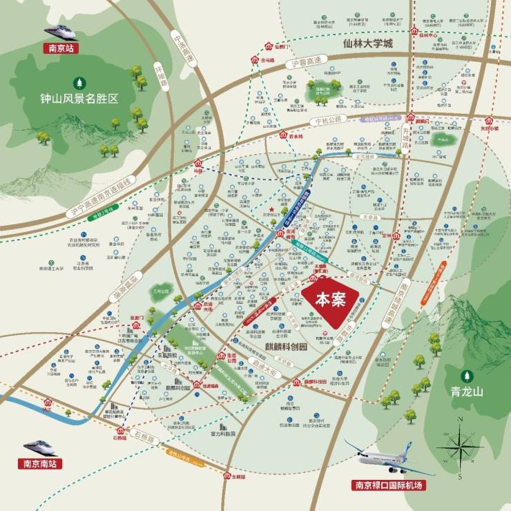南京主城东部,紫金山与青龙山生态廊道之间,距离新街口直线仅10公里,是连接仙林大学城与江宁大学城的科创枢纽。