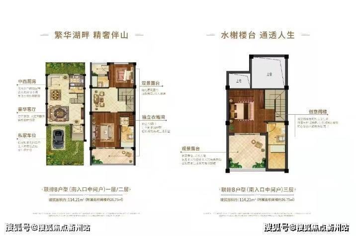 联排别墅:中间户115平方,边户143平方。