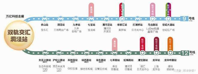 轨交:坐拥地铁 12 号线西延伸段(在建)与 9 号线双轨枢纽。其中,12 号线西延伸段沪松公路站与项目 2 号楼零距离衔接,预计 2027 年底通车,可直达漕河泾、南京西路、苏河湾等高能级商圈;地铁 9 号线泗泾站距离项目较近,6 站直达徐家汇,串联松江新城、七宝、漕河泾等核心板块。