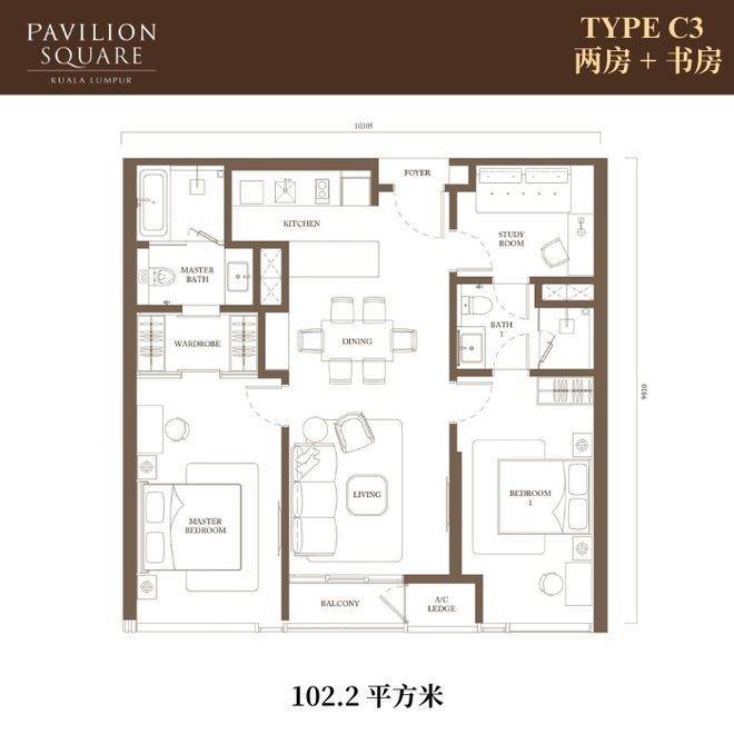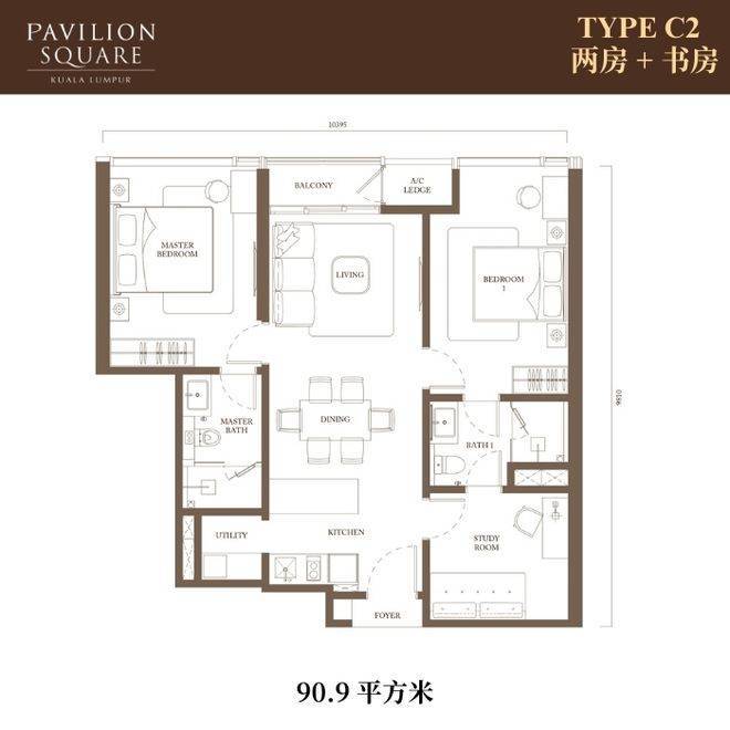 两房+书房:2,332,000马币起(91-118平方米)