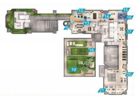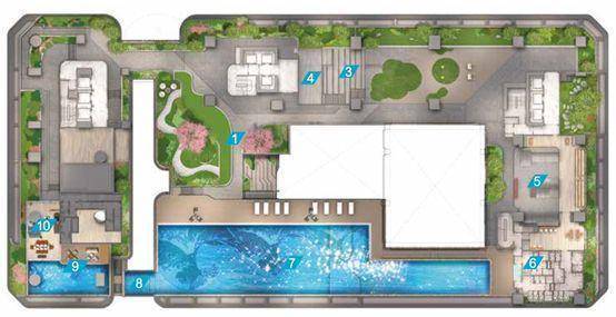 1. 瀛石园林 / 2. 跃动球馆 / 3. 观景台阶 / 4. 贤谈 / 5. 滑板极限翔 / 6. 桑拿及蒸气坊 / 7. 浮绘天池 / 8. 水漾天廊 / 9. 池畔烧闲汇 / 10. 尚汇馆 / 11. 旋风滑梯 / 12. 童趣历奇 / 13. 盛汇厅 / 14. 游戏领域 / 15. 钢琴室 / 16. 乐队演奏厅 / 17. 优闲雅座 / 18. 豊迎庄园 / 19. 岚竹茶庐 / 20. 健身天地 / 21. 瑜伽空间