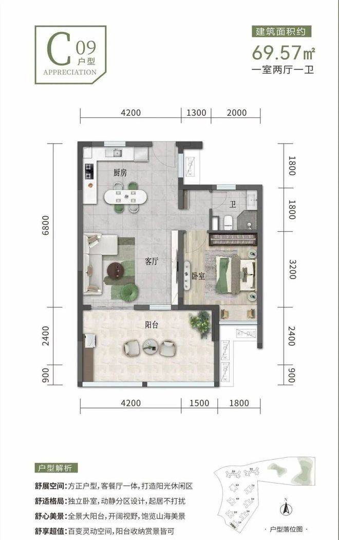 建筑面积约69-104㎡一至三房,方正开阔空间,户户阳台,动静分离,功能分区,厨房、阳台等多功能配套,全能居家,旅居休憩或家庭度假皆可。