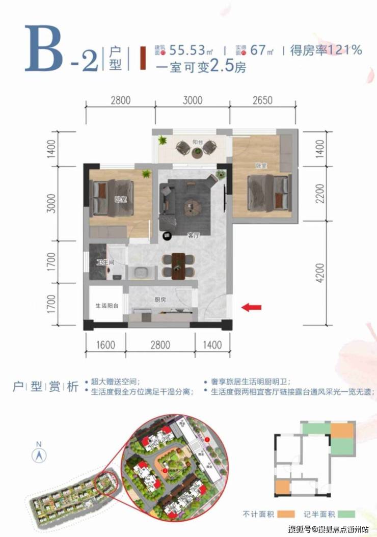 面积55.53平米赠送13平米两室一厅