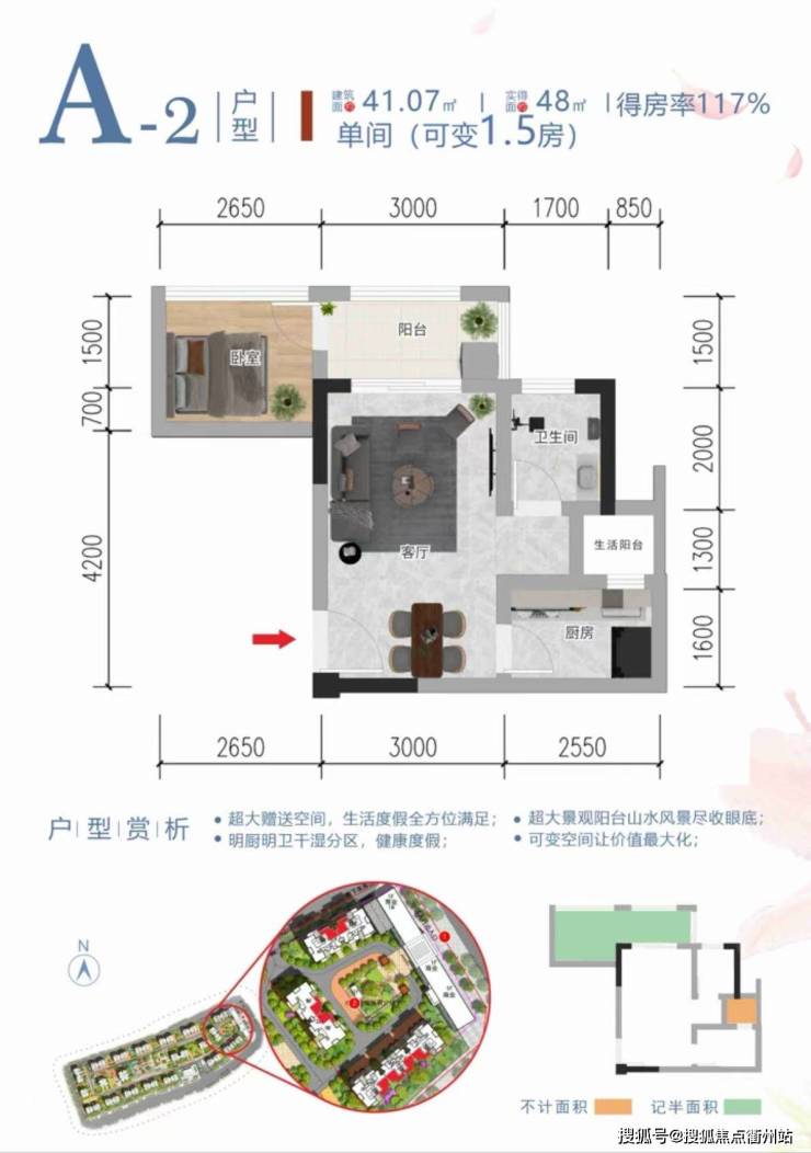 面积41.07平米赠送7平米,一室一厅