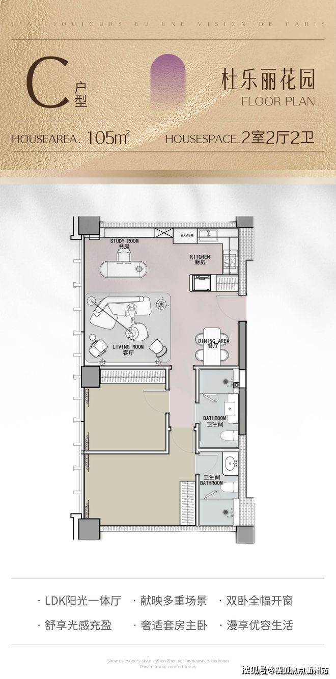 105㎡:2 房 2 厅 2 卫,以杜乐丽花园为主题,布局精巧,空间利用合理,满足小家庭的居住需求。
