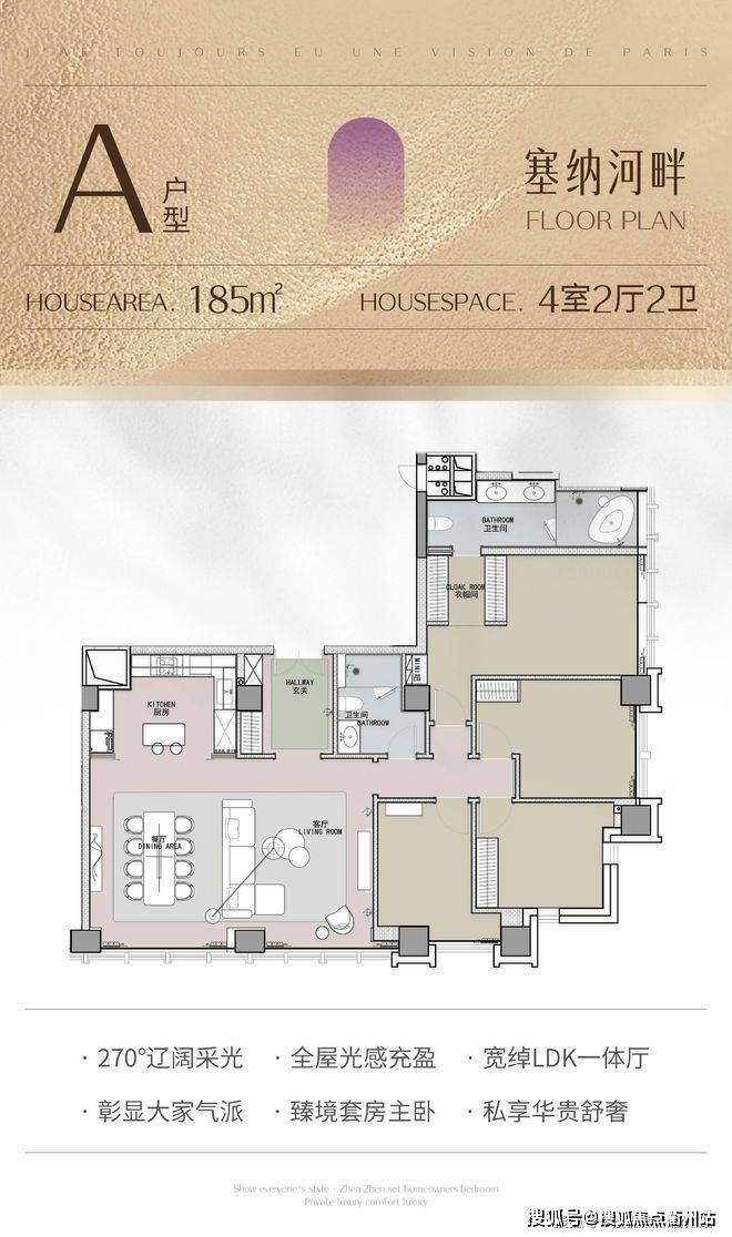 185㎡:4 房 2 厅 2 卫,塞纳河畔主题,四房的设计能满足三代同堂或多人口家庭的生活需求。