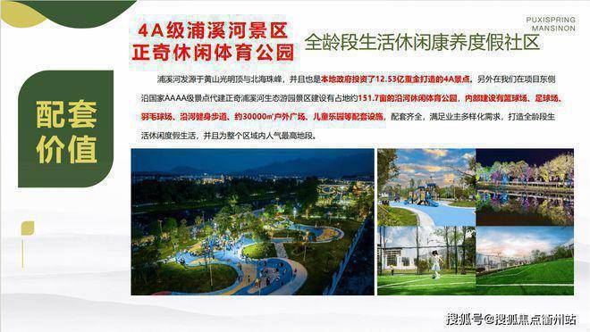 浦溪河,发源于黄山光明顶与北海珠峰,并且也是本地政府投资了12.53亿重金打造的4A景点。另外在我们在项目东侧沿国家AAAA级景点代建正奇浦溪河生态游园景区建设有占地约151.7亩的沿河休闲体育公园,内部建设有篮球场、足球场、羽毛球场、沿河健身步道、约30000㎡户外广场、儿童乐园等配套设施,配套齐全,满足业主多样化需求,打造全龄段生活休闲度假生活,并且为整个区域内人气最高地段。