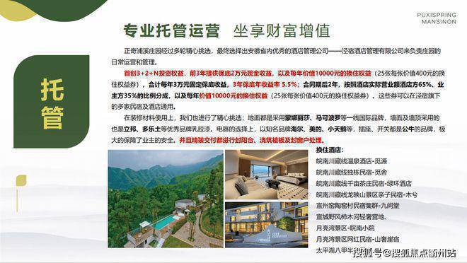 正奇浦溪庄园经过多轮精心挑选,最终选择出安徽省内优秀的酒店管理公司——泾县泾宿酒店管理有限公司来负责庄园的日常运营和管理。首创3+2+N投资权益,前3年提供保底2万元现金收益,以及每年价值10000元的换住权益(25张每张价值400元的换住权益券),合计每年3万元固定保底收益,3年保底年收益率 5.5%;合同期后2年,按照酒店实际营业额酒店方65%、业主方35%的比例分成,以及每年价值10000元的换住权益(25张每张价值400元的换住权益券)。酒店享有一站式的生活服务,精美特色伴手礼、汉服体验、闪住服务、叫醒服务、自助洗衣、机器人服务、行李寄存、定制旅行攻略、订餐服务等,满足客户需求,享受到高品质的生活体验。换住权益券可以在泾宿旗下的多家民宿及酒店通用,包含皖南川藏线温泉酒店-觅源、皖南川藏线独栋民宿-觅舍、皖南川藏线千亩茶庄民宿-绿环酒店、皖南川藏线龙映山景区亲子民宿-木兮、宣州窑陶窑村民宿集群-九间堂、宣城野风柿木河轻奢营地、月亮湾景区-皖南小院、月亮湾景区网红民宿-山奢崖宿、太平湖八甲半岛民宿等,让您能够轻松兑换到高品质的住宿体验。