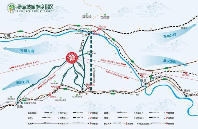 绿葱坡旅游度假区距县城48公里,宜巴高速、郑万高铁公里,209国道、巴野公路贯穿,紧邻沪渝高速、沪蓉高速、神张高速(在建)。东至武汉,西往重庆,北至郑州、襄阳。距巴东站、建始高坪站、巴东北站3大高铁站均在小时车程内。