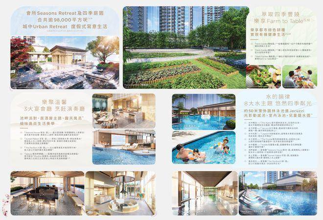 配套设施方面:项目设有面积约47,278平方呎的多层式住客会所「Seasons Retreat」及占地约51,066平方呎四季庭园,提供包括八大主题的水上设施,当中包括约50米室外游泳池,儿童嬉水园等,以及健身室、美术室及四季水疗等设施。