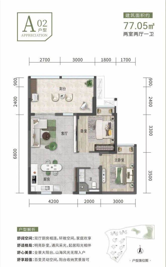 建筑面积约69-104㎡一至三房,方正开阔空间,户户阳台,动静分离,功能分区,厨房、阳台等多功能配套,全能居家,旅居休憩或家庭度假皆可。