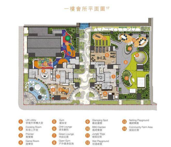 配套设施方面,屋苑于1楼设有5,578平方呎两层住客会所及9,580平方呎园林区/绿化地带,提供包括料理工作室、私人剧院、青莲雅座、中庭庄园、宠物公园、烧烤乐园、山泉瀑布等约20项设施。项目以澳洲SUBURB LIFESTYLE作设计蓝本,以自然绿化为设计主调,引进大量绿化及天然石材,透过不同材质、纹理和设计轮廓创造出一个现代、鼓舞人心和轻松的环境。