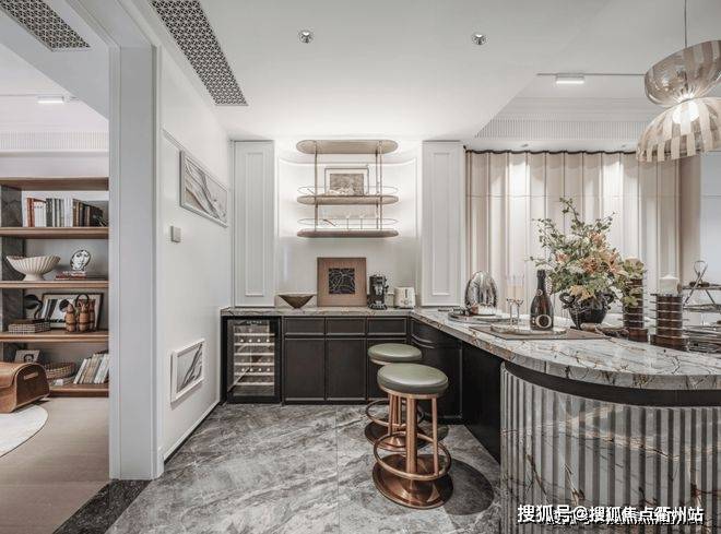 更好更奢的归家门庭,嘉佩乐酒店风格,海派元素充满空间的每一个角落,地面的复古花纹,金属镂空装饰墙,普拉达绿的奢石点缀,仿佛穿越到了摩登时代。