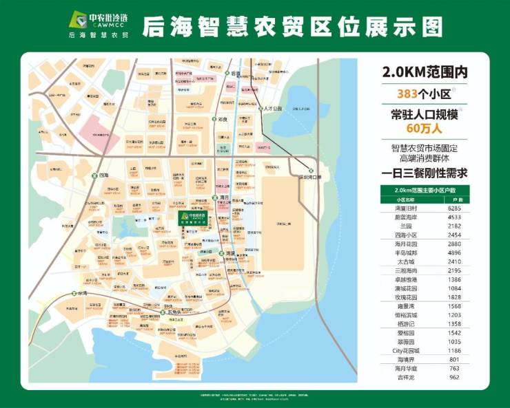 后海智慧占据社区核心地段,来往客户流巨大,2KM内湾厦旧村(6285户)、蔚蓝海岸(4533户)、兰园(2182户)、四海小区(2454户)、海月花园(2880户)、半岛城邦(4896户)、太古城(2410户)、三湘海尚(2195户)、卓越维港(1386户)、奥城花园(1084户)、玫瑰花园(1828户)、雍景湾(1568户)等等,项目2公里覆盖383小区约60.7万人口。全龄消费体系为市集运作提供强有力的消费支撑。