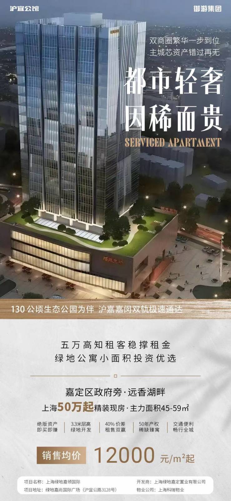 集精装酒店式公寓、鼎级办公、高端商业于一体,与绿地先期开发的嘉创国际(万怡酒店)比肩而立,形成嘉定罕有的双子楼高端商业综合体。绿地嘉领国际酒店式公寓,35~58㎡精装空间3.3米层高。具备星级酒店管理,楼下即是鼎盛商圈。绿地嘉领国际写字楼面积约93~122㎡,阔绰大堂、中央空调、急速电梯、智能系统、管家式服务以及充裕停车位等软硬件配置,为世界500强CEO定制全球化商务平台。