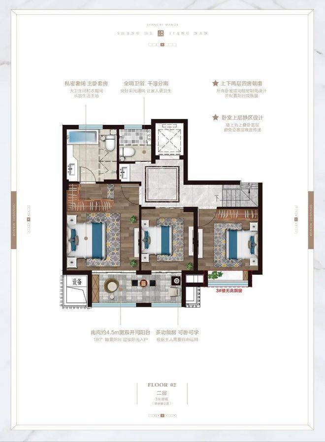 相比市面常见的90㎡小三房,这样的尺度更舒适,主卧套房设计,预留了衣帽间和独立卫浴,兼具功能性与舒适度。