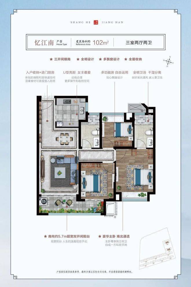 该户型三开间朝南,客餐厅一体化,南向拥有约5.7米“跑道式”阳台晾晒功能的同时,还能兼顾居家休闲娱乐。