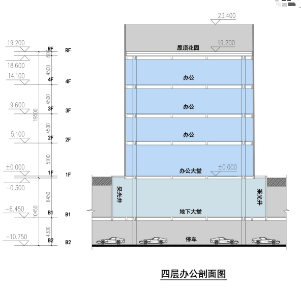 五层结构:2-5层4.2米、首层5.1米,负一层6.45米,负二层4.3米,