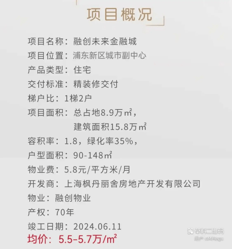 项目面积:总占地8.9万㎡建筑面积15.8万m容积率:1.8,绿化率35%,户型面积:90-148m物业费:5.8元/平方米/月开发商:上海枫丹丽舍房地产开发有限公司物业:融创物业产权:70年